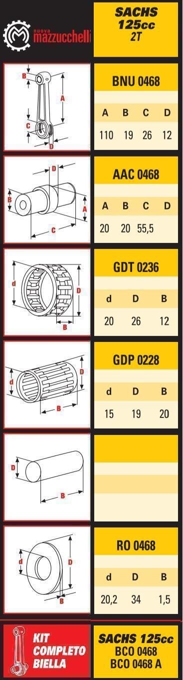 Kit Bielle Mazzuchelli - Sachs 125 cc Kit bielle complet : bielle, axe, cage à aiguille Entraxe = 110 mm... En savoir plus